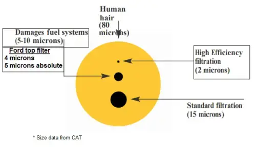 The 1R0749 filters are 98% efficient at 2 microns. Giving it a 2-micron absolute rating, the Ford top filter is rated 4 microns and only 5 microns absolute.