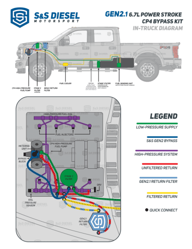 The S&S Diesel Motorsport Gen2.1 6.7L Power Stroke CP4 Bypass Kit features all quick connect lines that will eliminate the need for cutting the factory supply line, which is a debris introduction point, especially if the cut is not thoroughly deburred. It also eliminates the need to use a compression fitting, which is a potential leak point. The OE-style quick connect lines also eliminate any threaded joints that are further leak points and have the potential of generating debris during install.