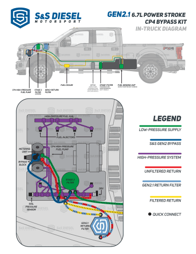 The S&S Diesel Motorsport Gen2 6.7L Power Stroke CP4 Bypass Kit features all quick connect lines that will eliminate the need for cutting the factory supply line, which is a debris introduction point, especially if the cut is not thoroughly deburred. It also eliminates the need to use a compression fitting, which is a potential leak point. The OE-style quick connect lines also eliminate any threaded joints that are further leak points and have the potential of generating debris during install.