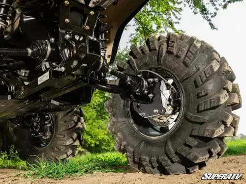 Max tire sizes are measured at full compression and full turn. The given tires sizes are the largest we fit without rubbing. With minor trimming or a small amount of rub, larger tire sizes can be used.