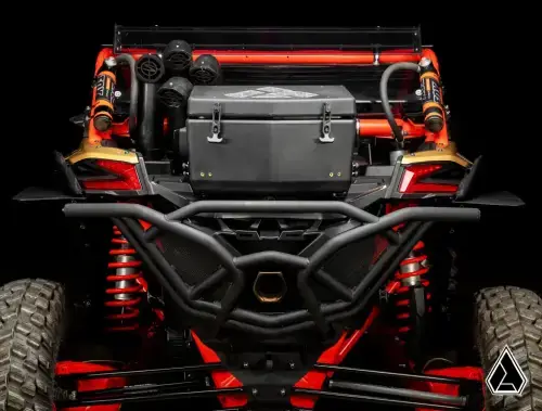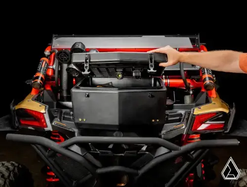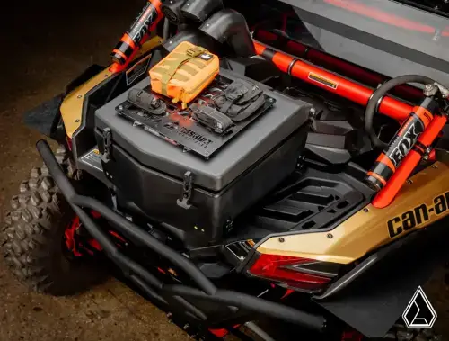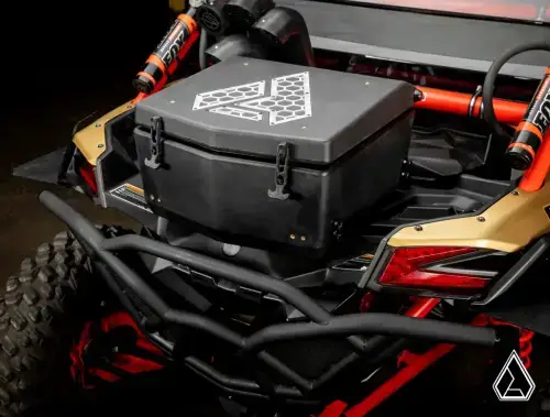 This cargo box and cooler is secured with hardcore steel brackets. That means it won’t slide around even if you’re absolutely flying up a nearly vertical dune. And it’s mounted with high-strength thumb screws that are simple to remove if you need to free up your bed space for some reason. Even if you go totally crazy, this cargo box will stay put.