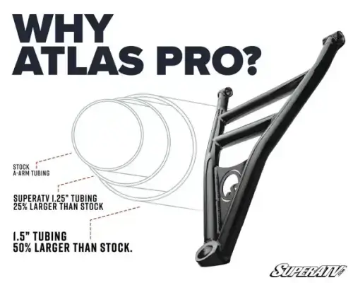 Atlas Pro is all about strength. As if the 1.5” diameter tubing wasn’t tough enough, they also sport .138” thick walls. They’re the burliest tubed arms on the market, and outdo OEM and other aftermarket arms by a long shot. Plus, they’re finished with a UV-resistant powder coating to give them the corrosion resistance you need.
