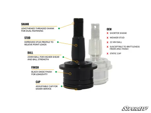 We got the strongest steel stud material we could get our hands on—hardened and black oxide coated 300M. Then we used it to make a stud that doesn’t narrow as much as stock. The result is a ball joint that’s 2.25x stronger than your OEM ball joint. Push your Talon to the limit with big tires and wild rides. With SuperATV’s Super Duty 300M ball joint, your suspension will be bulletproof.
