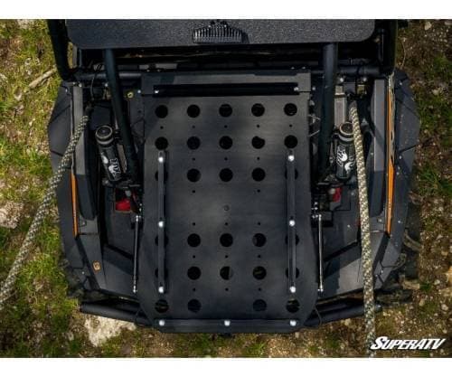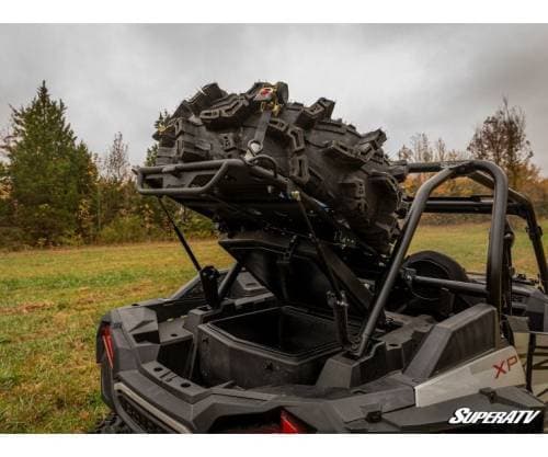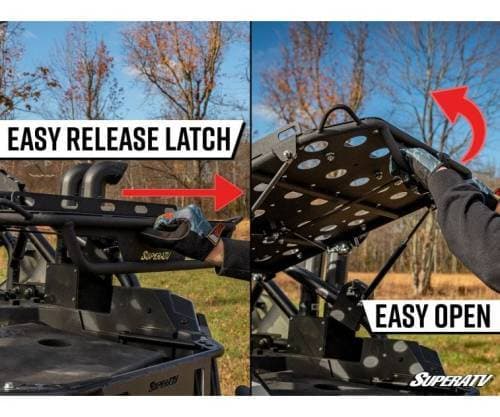There are plenty of UTV cargo racks on the market, but very few offer what this one does. Reliable ball-studded gas struts make it easy to raise and lower the platform as needed—just turn the lever and push up. It automatically locks into place upon closure, so no need to worry about latching it. The platform sits above your machine’s bed so you can pile your stuff up top and still utilize all that space below. It’s the perfect storage solution for riders who like to be prepared, and it even doubles as a spare tire carrier!
