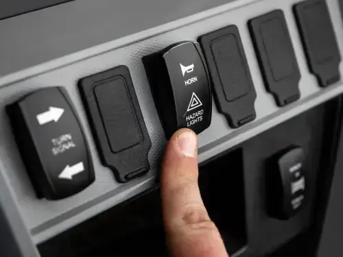 This turn signal kit includes four amber-colored LED indicator lights, two for each side on the front. It also connects to your OEM tail lights to turn them into turn signals. They’re controlled with a pair of handy dash-mounted rocker switches. One rocker controls your left and right turn signals. The other switch controls the hazard light function and the horn. And the rocker switches are lit from behind, so it’s easy to see in the dark. Now that’s convenient!
