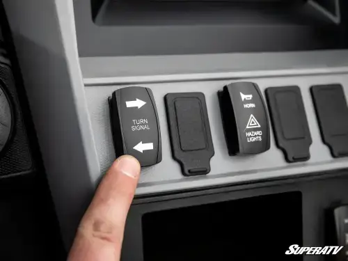 Dash-mounted rocker switches control your turn signals. A short press starts a standard signal and a long press gives you a slightly longer turn signal duration. A second rocker switch controls hazard light mode and the included horn. And they’re all lit from behind so they’re easy to see even on dark nights.