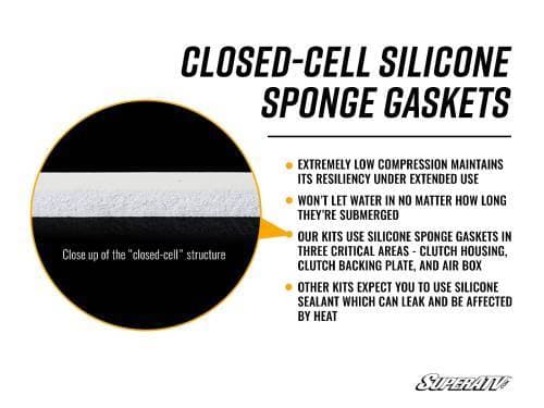 We’re obsessed with keeping water out. We use closed-cell silicone sponge gaskets—not just silicone—to seal your clutch housing and air box. These gaskets are like neoprene combined with body armor and won’t let any water in no matter how long they’re submerged. They’re tough and tight and you won’t find a better gasket anywhere else. Literally, no one else sells a snorkel kit with gaskets like this. Don’t risk ruining your ride—trust the only guys that turn waterproofing up to 11 (that’s us).