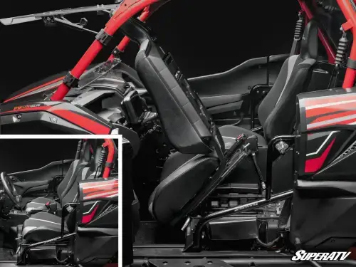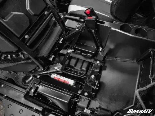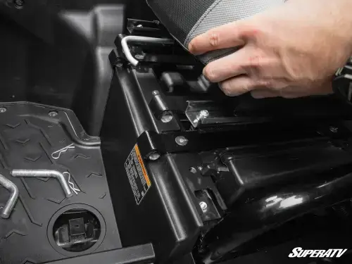 Our KRX 1000 seat tilt kit comes with preassembled passenger and driver’s side seat bases. Once bolted in place, you can pull the lever to tilt them forward and give you access to storage and your air filter. By pulling the pins, you can remove the seats completely to make cleaning up easier. If you want to pack gear without getting frustrated, our flip-up seat base is the way to go.
