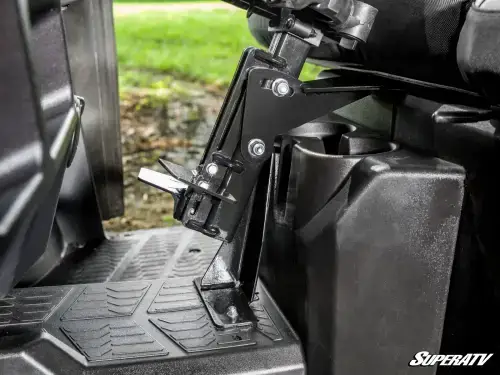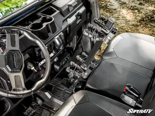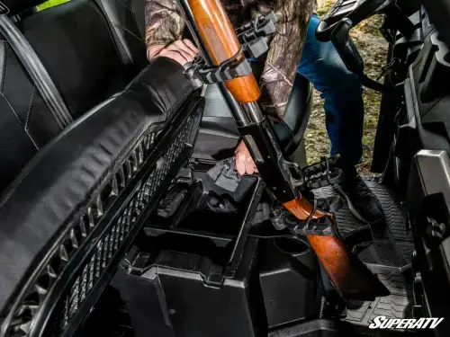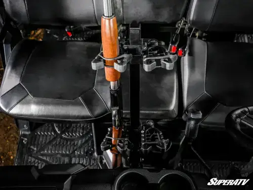 We designed this gun holder with an adjustable base and mount so you can position your firearm just the way you like it. The butt plate ensures your gun stays put, and when hunting season's over, you can easily take it off with the thumb screws. Plus, it only takes up the middle seat—you can keep your guns secure and still leave room for your buddy to sit comfortably.