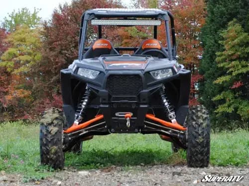SuperATV High Clearance A-Arms for Polaris RZR XP 1000 (Adjustable, Both (Only Lower A Arms are Adjustable, Super Duty 300M, Black) The Suspension Upgrade You Need Have you ever found yourself going around a rock or stump while all your buddies sailed over it with no problem? If you answered “yes,” it’s probably time to think about giving that stock suspension an upgrade. SuperATV has just what your Polaris RZR XP 1000 needs with our High Clearance A-Arms. A clever bend design delivers extra ground clearance, and the adjustable pivot blocks allow you to adjust your camber as needed. Top it all off with stronger steel and bigger tubing and you’ve got yourself a truly unmatched set of A-arms.