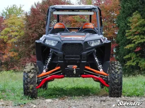 SuperATV High Clearance A-Arms for Polaris RZR XP 1000 (Adjustable, Lower, Super Duty 300M, Red) The Suspension Upgrade You Need Have you ever found yourself going around a rock or stump while all your buddies sailed over it with no problem? If you answered “yes,” it’s probably time to think about giving that stock suspension an upgrade. SuperATV has just what your Polaris RZR XP 1000 needs with our High Clearance A-Arms. A clever bend design delivers extra ground clearance, and the adjustable pivot blocks allow you to adjust your camber as needed. Top it all off with stronger steel and bigger tubing and you’ve got yourself a truly unmatched set of A-arms.