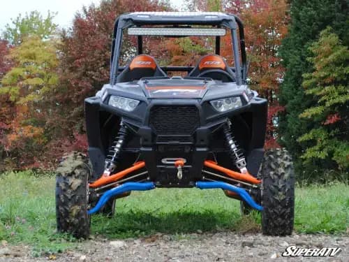 SuperATV High Clearance A-Arms for Polaris RZR XP 1000 (Non-Adjustable, Lower, Super Duty 300M, Blue) The Suspension Upgrade You Need Have you ever found yourself going around a rock or stump while all your buddies sailed over it with no problem? If you answered “yes,” it’s probably time to think about giving that stock suspension an upgrade. SuperATV has just what your Polaris RZR XP 1000 needs with our High Clearance A-Arms. A clever bend design delivers extra ground clearance, and the adjustable pivot blocks allow you to adjust your camber as needed. Top it all off with stronger steel and bigger tubing and you’ve got yourself a truly unmatched set of A-arms.