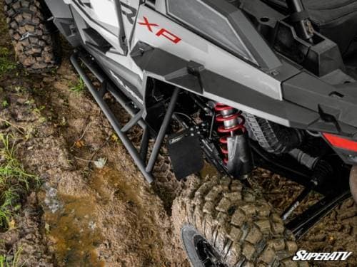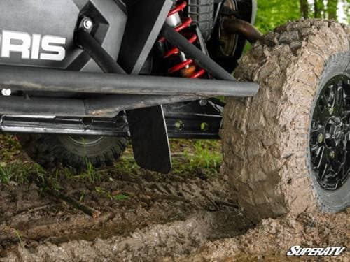 The tough but flexible LDPE mud flaps mount to your OEM or SuperATV trailing arms with a heavy-duty steel bracket. The bolt-on installation is dead simple and requires no drilling or modification. The 7” by 11” guard can take on your rooster tail and more without falling apart. Plus, they fold out of the way when sliding over rocks and logs so you don’t get hung up.