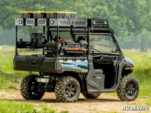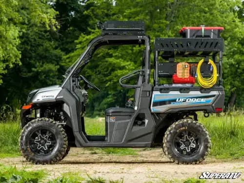 SuperATV Outfitter Bed Rack for CFMoto Uforce 1000 (w/ lights, 1 Shelf) Add More Bed Space If you need more room to carry your tools and cargo, you need SuperATV's Outfitter Bed Rack. It installs above your rig's bed and provides nearly 16 square feet of additional cargo space. It even comes with built-in spots to add recessed cube lights. •Lofted storage area above the bed •Multiple install positions to suit your needs •Convenient 2" T-slots and MOLLE panels •Built to last with powder-coated aluminum
