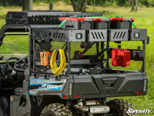 SuperATV Outfitter Bed Rack for CFMoto Uforce 1000 (w/ lights, no shelf) Add More Bed Space If you need more room to carry your tools and cargo, you need SuperATV's Outfitter Bed Rack. It installs above your rig's bed and provides nearly 16 square feet of additional cargo space. It even comes with built-in spots to add recessed cube lights. •Lofted storage area above the bed •Multiple install positions to suit your needs •Convenient 2" T-slots and MOLLE panels •Built to last with powder-coated aluminum