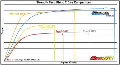 We make them twice as strong through better design and materials. With an all 4340 chromoly steel alloy construction and larger axle shafts and CV joints, we’ve made Rhino 2.0 nearly two times stronger than stock UTV axles. Plus, they use puncture resistant CV boots and run cool at high articulation angles.