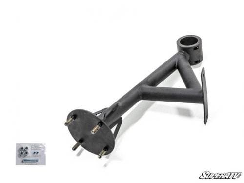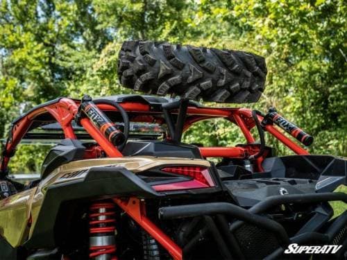 Our spare tire carrier has room enough for up to a 34” tire mounted on a wheel with a standard 6+1 backspacing. It’s made specifically for the maverick and uses a 4/137 bolt pattern. With your tire and wheel mounted and ready to go, there’s nothing that can stop your UTV.