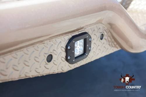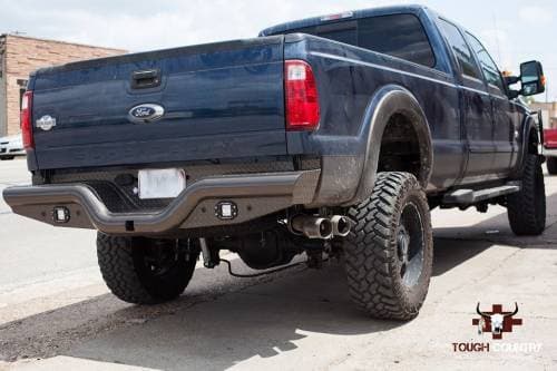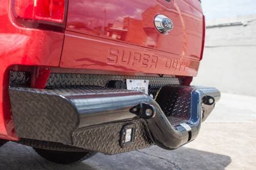 Tough Country’s founding product was the Deluxe Rear Bumper. The state of the art design features a continuously flowing 4? pipe base with a built-in flush mount receiver. -Tough Country’s founding product -Only Rear Bumper on the market with continuous flowing schedule 40, 4” Pipe Base -Built in Flush Mount Receiver -Standard finish is a high gloss black industrial powder coat -The base model deluxe rear bumper comes standard with a 8? drop, complete with license plate lights, 7 Way Mount and safety chain attachment points. 10? Drop optional. -Customizable Options Available NOTE: Not all accessory shanks will work with the Deluxe Rear Bumper. This bumper requires at least 5-1/4” of unobstructed shank from pin hole to ball mount platform or any gussets. This is to allow it to pass through the 4” pipe and be pinned on the back side of the bumper. The factory receiver must be removed to install the Deluxe Rear Bumper.