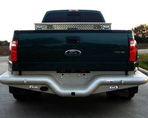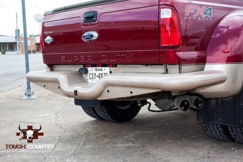 Tough Country’s founding product was the Deluxe Rear Bumper. The state of the art design features a continuously flowing 4? pipe base with a built-in flush mount receiver. -Tough Country’s founding product -Only Rear Bumper on the market with continuous flowing schedule 40, 4” Pipe Base -Built in Flush Mount Receiver -Standard finish is a high gloss black industrial powder coat -The base model deluxe rear bumper comes standard with a 8? drop, complete with license plate lights, 7 Way Mount and safety chain attachment points. 10? Drop optional. -Customizable Options Available NOTE: Not all accessory shanks will work with the Deluxe Rear Bumper. This bumper requires at least 5-1/4” of unobstructed shank from pin hole to ball mount platform or any gussets. This is to allow it to pass through the 4” pipe and be pinned on the back side of the bumper. The factory receiver must be removed to install the Deluxe Rear Bumper.