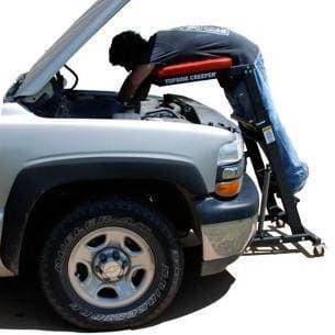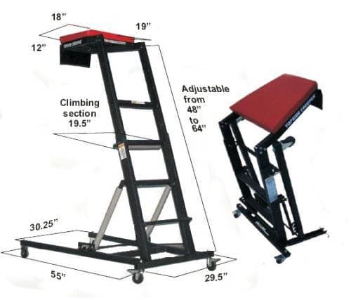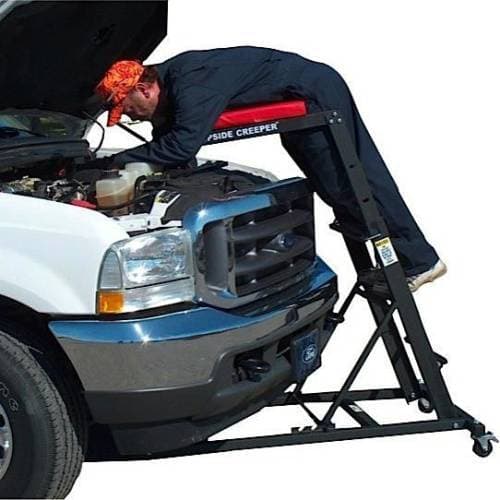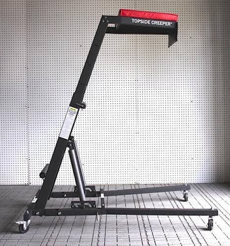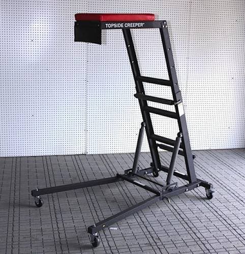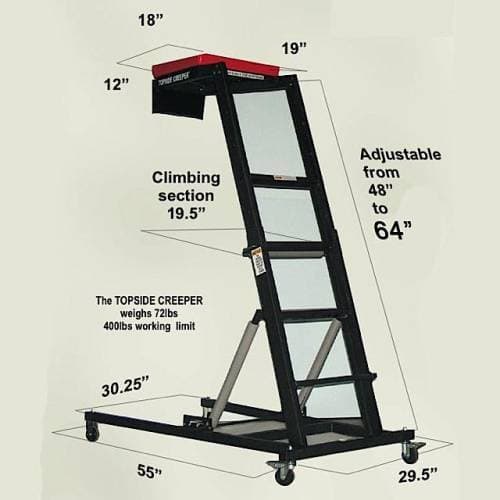 The height of the Topside Creeper can be adjusted to allow usage on many different types of vehicles (adjust from 48" to 64" tall). It is constructed of heavy gauge steel and has a powder coat finish to protect from scratching and has a 400lb weight limit. The deck is padded and covered with a heavy vinyl for comfort and durability. The key is comfort, stability and maneuverability. It allows you to reach the back of the engine compartment without having to climb on the vehicle and allows extended periods of time without fatigue in the legs and lower back. The great feature is that it can easily be folded for storage.