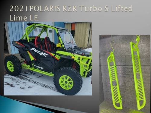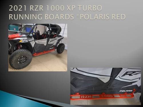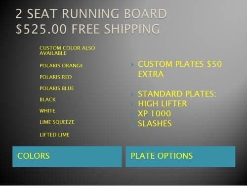 Custom made running boards, made from 1” schedule 40 pipe. Powder coated to match OEM Polaris colors or custom colors available. Made to order in house.